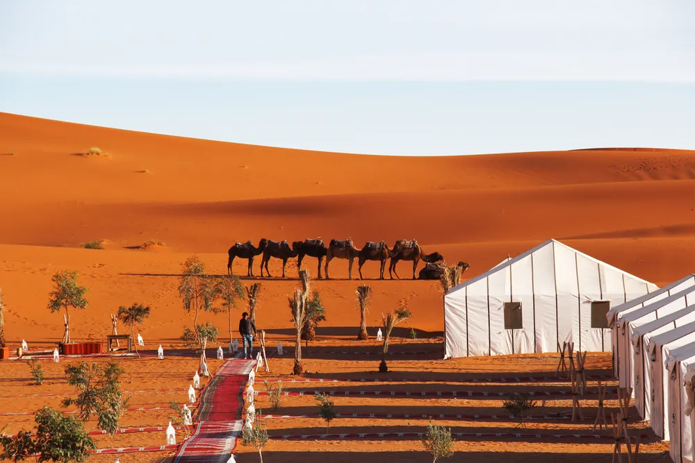 Experimentarás el desierto en nuestro tour de 7 días con salida desde Tánger y llegada a Marrakech. Hoy tendrás dos experiencias: un paseo en camello y una excursión por el desierto. Comenzarás tu excursión visitando el pueblo de Khamlia. Aquí, saborearás un té de menta mientras escuchas música gnawa. También visitarás familias nómadas y las minas de Mifisi. Después, disfrutarás de una vista panorámica del desierto y explorarás un lago. Finalmente, regresaremos al hotel y nos prepararemos para un paseo en camello. Esta excursión incluye la puesta de sol y sandboarding. También tendrás la oportunidad de escuchar música y pasar la noche en tiendas bereberes.