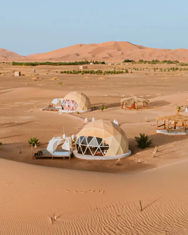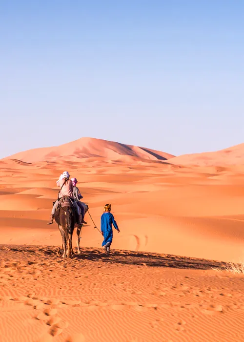 Dopo colazione, inizieremo il nostro viaggio nel deserto. Poi faremo un tour in 4×4 nel deserto di Erg Chebbi. La nostra prima tappa sarà a Khamlia, dove ascolteremo la musica Gnaoua. Visiteremo anche le miniere del deserto a Mifis e faremo una gita per incontrare i nomadi e vedere un’oasi di palme. Potremo anche godere di una vista panoramica da dietro le dune. Torneremo al vostro alloggio dopo il pranzo nel villaggio di Khamlia e inizieremo la vostra escursione in cammello. Passerete la notte nel campo e vi godrete la musica dei tamburi. Questa è una fantastica occasione per fotografare il tramonto e l’alba, divertendovi anche con il sandboarding. Passerete la notte nel campo sotto le stelle.