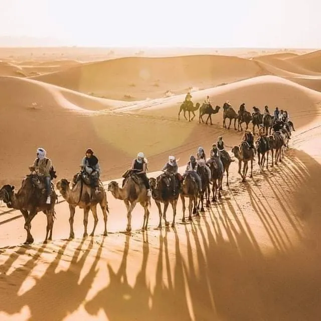 Godrai di un’intera giornata di avventure nel deserto. Dopo la colazione, visiteremo il villaggio di Khamlia, dove ascolterai la musica gnawa originaria del Mali e del Niger. In seguito, incontrerai famiglie nomadi che vivono in tende tradizionali. Visiteremo anche le miniere di Mifis e il lago del deserto. Nel pomeriggio vivrai un’esperienza indimenticabile: un giro in cammello attraverso le dune dell’Erg Chebbi fino al campo nel deserto. La sera godrai del tramonto, di una cena tipica e della musica intorno al fuoco.