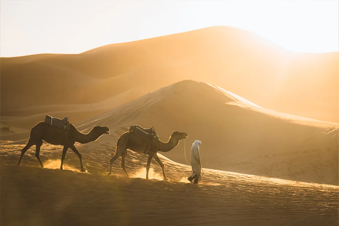 Next, pass through Erfoud, known for its fossils and lively desert markets, before reaching Merzouga, the gateway to the Sahara Desert. Here, your camels await to carry you across the golden dunes of Erg Chebbi just in time for sunset. As the night falls, enjoy a delicious traditional dinner, live Berber drumming, and stargazing around the campfire. Spend the night in a cozy Merzouga desert camp, surrounded by the tranquil silence of the Sahara.