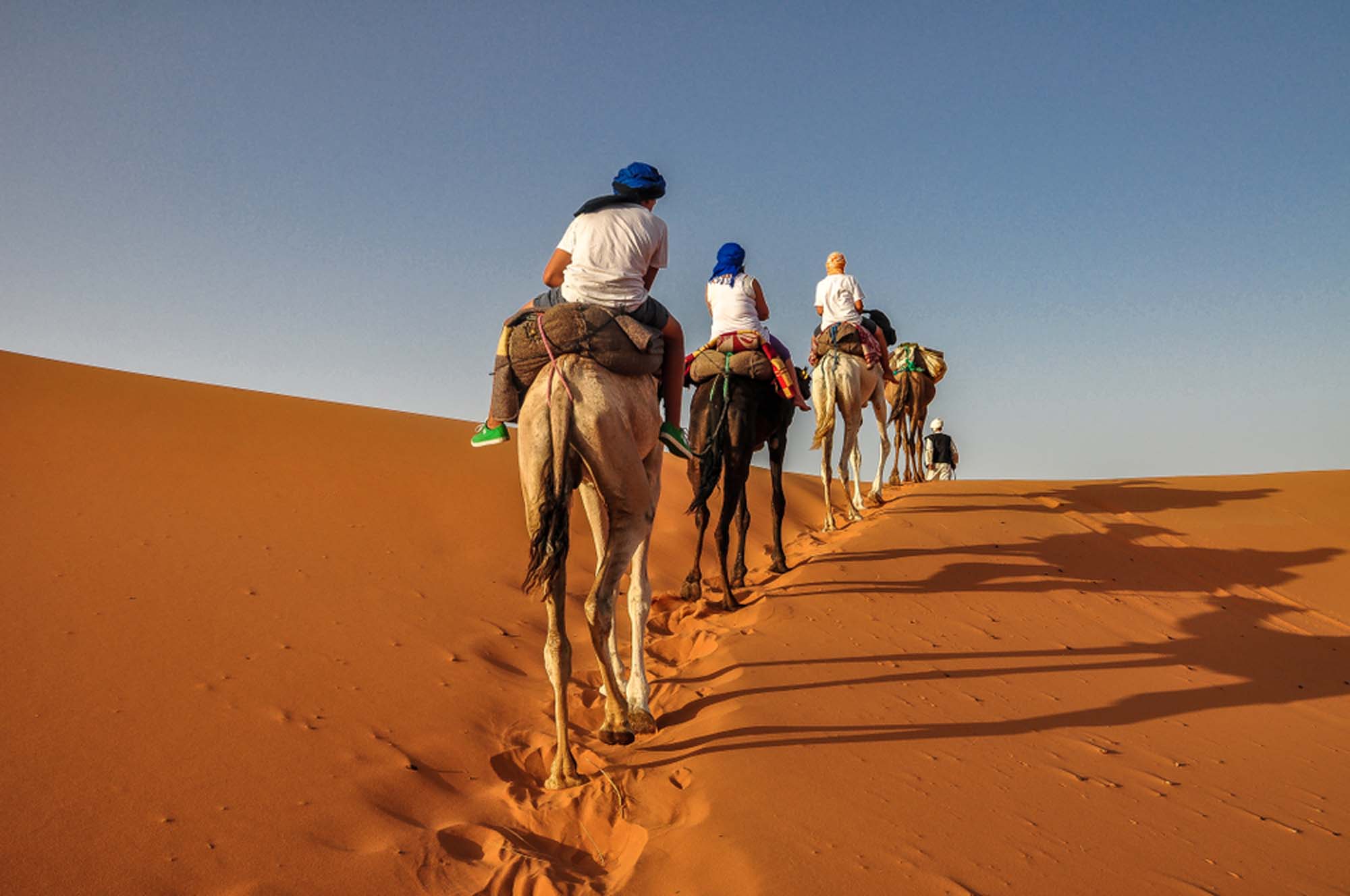 You will begin your discovery of the mysterious Merzouga after breakfast. As a result, we’ll travel through Merzouga and the sand dunes, stopping to meet nomad communities living in tents. We’ll also go to Mifis to see how the iron mines operate. Then we’ll drive you to Khamlia’s Gnaoua village. You will meet the Gnaoua people and listen to their music while you are there. We will return to the hotel after lunch, where you will ride camels. Then you’ll make your way to the camp via the sand dunes. Finally, you’ll spend a night among the locals, listening to their music.